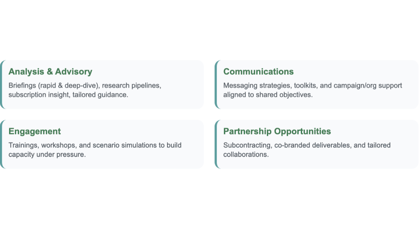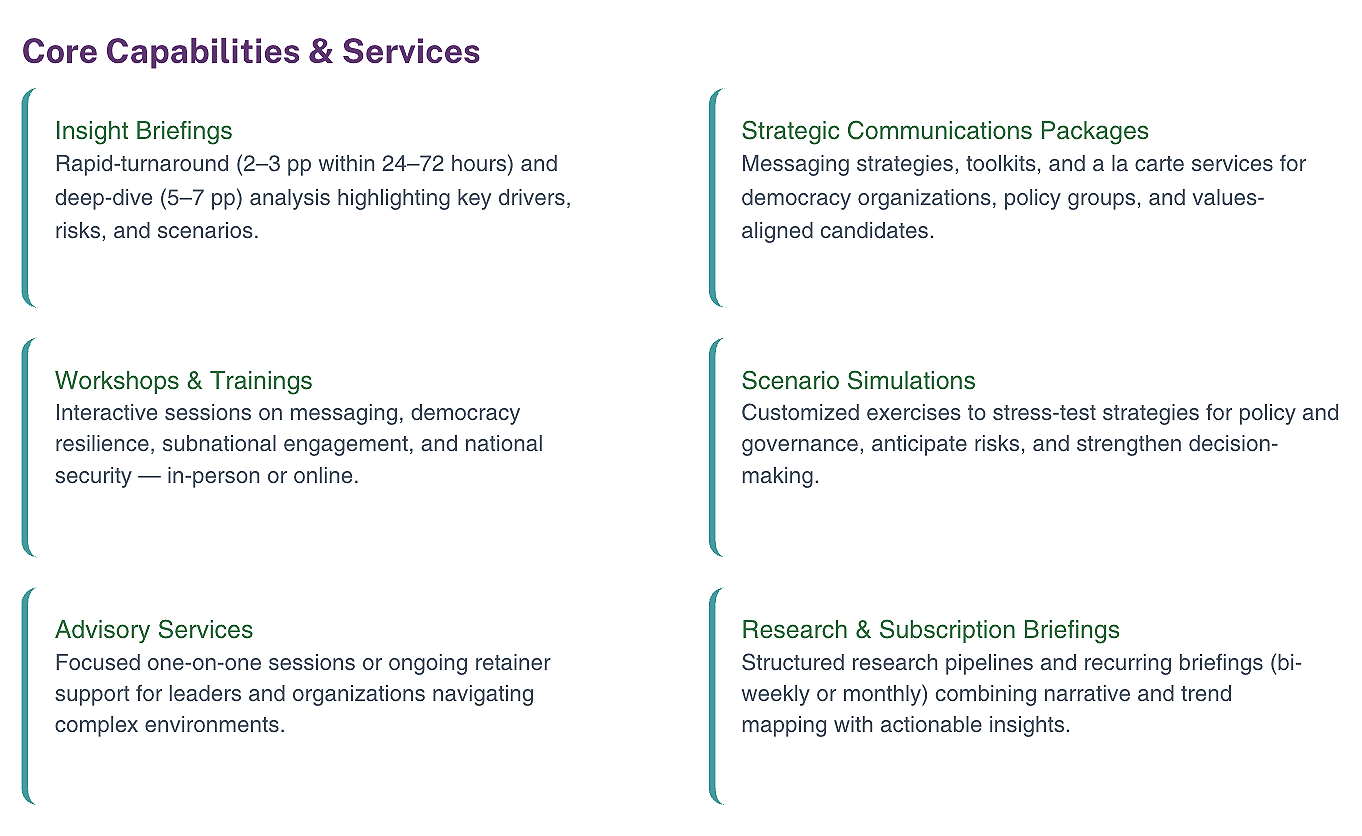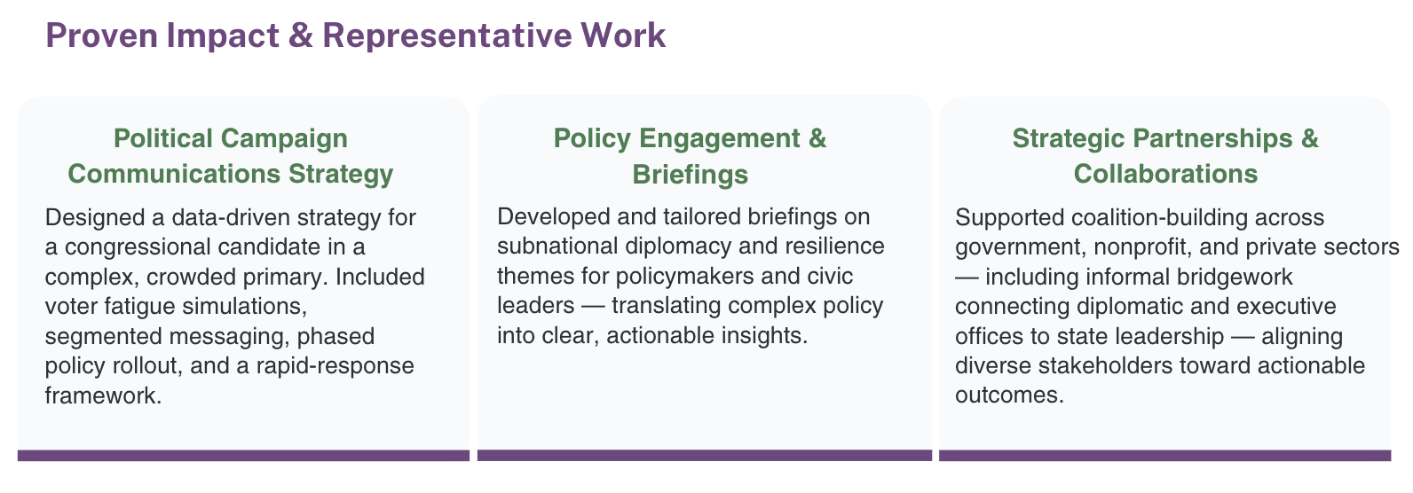 I partner with mission-driven organizations, policymakers, and values-aligned leaders to bring clarity and strategy to complex challenges. My focus is on translating national security, democracy resilience, and subnational engagement into practical tools. Each engagement is designed to foster meaningful dialogue and equip decision-makers with the insight to act with confidence.